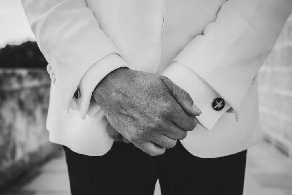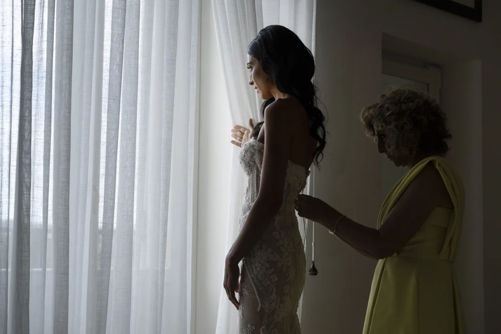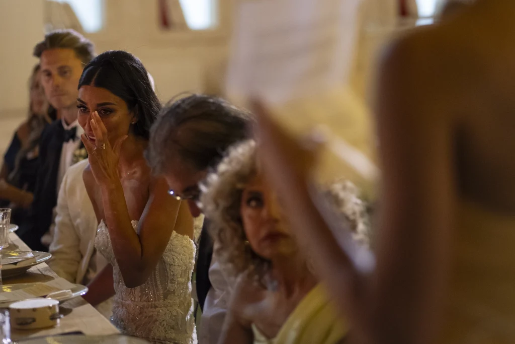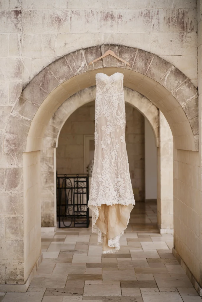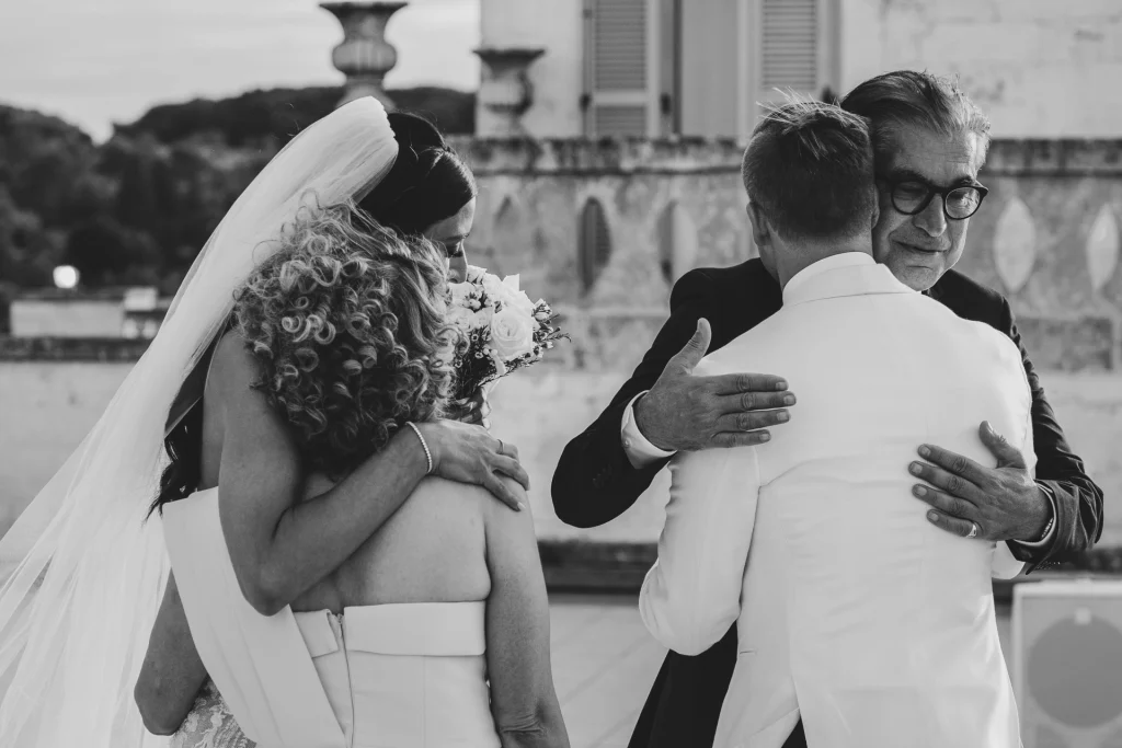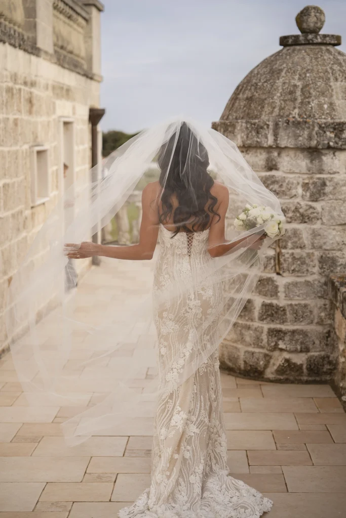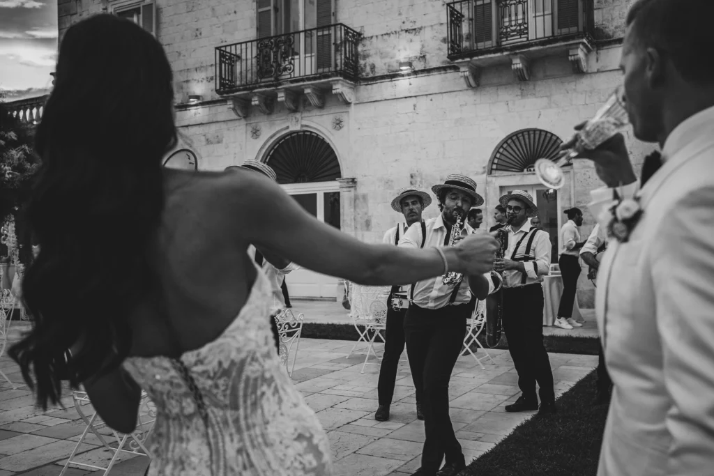 Il momento più toccante è stato senza dubbio la cerimonia all’aperto, celebrata in un angolo ombreggiato del giardino, circondati da amici, ulivi e luce dorata. Il calore della Puglia, unito alla commozione degli ospiti e alla complicità degli sposi, ha reso ogni istante prezioso. La Masseria Traetta, con le sue linee sobrie e la sua eleganza naturale, ha esaltato i colori caldi del tramonto, offrendo la cornice ideale per uno shooting fotografico che mescola glamour e verità. Ho scelto di raccontare ogni momento in modo discreto ma intenso: dai primi sguardi degli sposi, ai balli sotto le stelle, ogni scatto ha voluto restituire l’atmosfera unica di questa giornata.