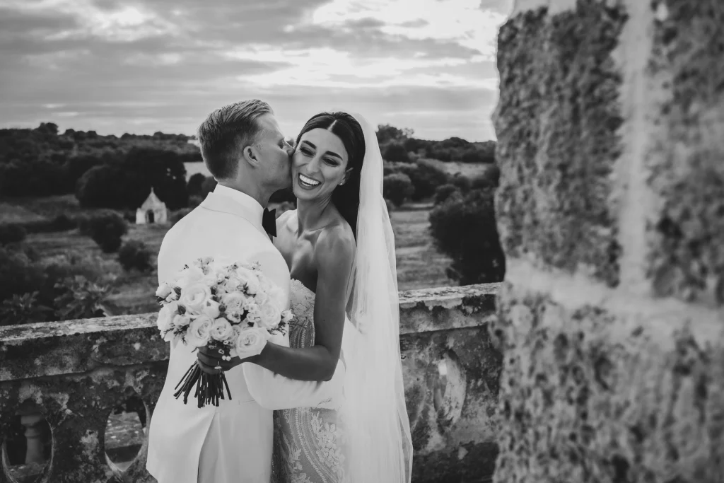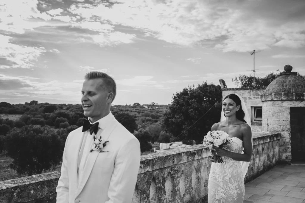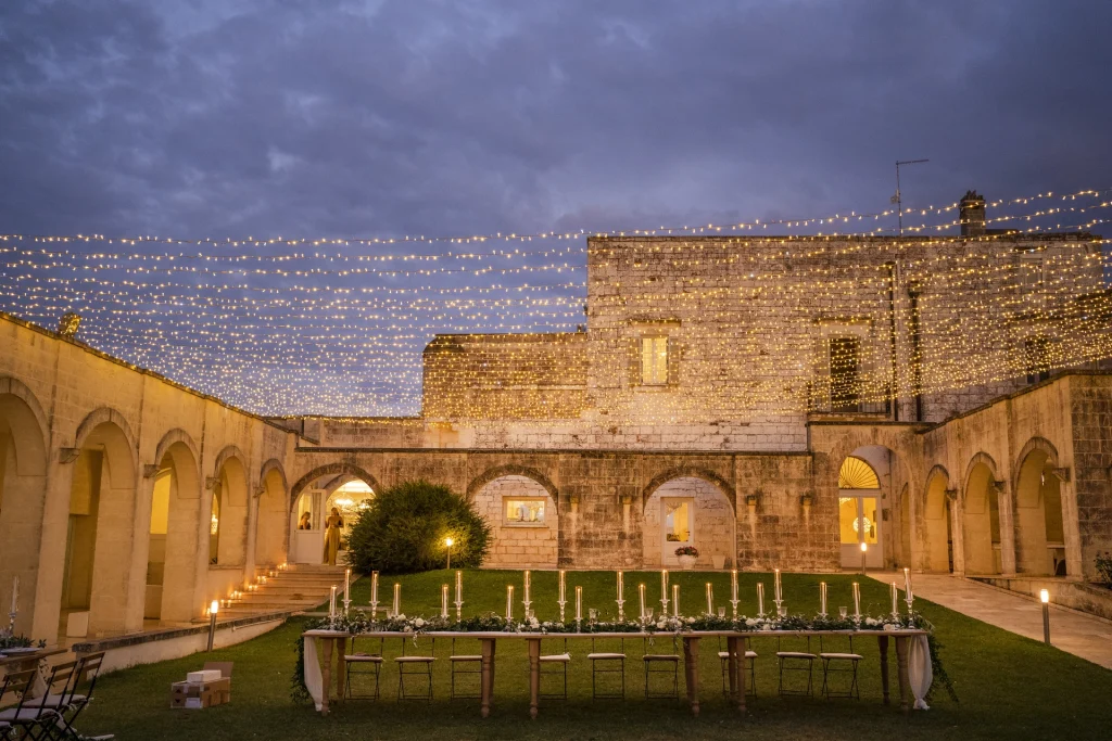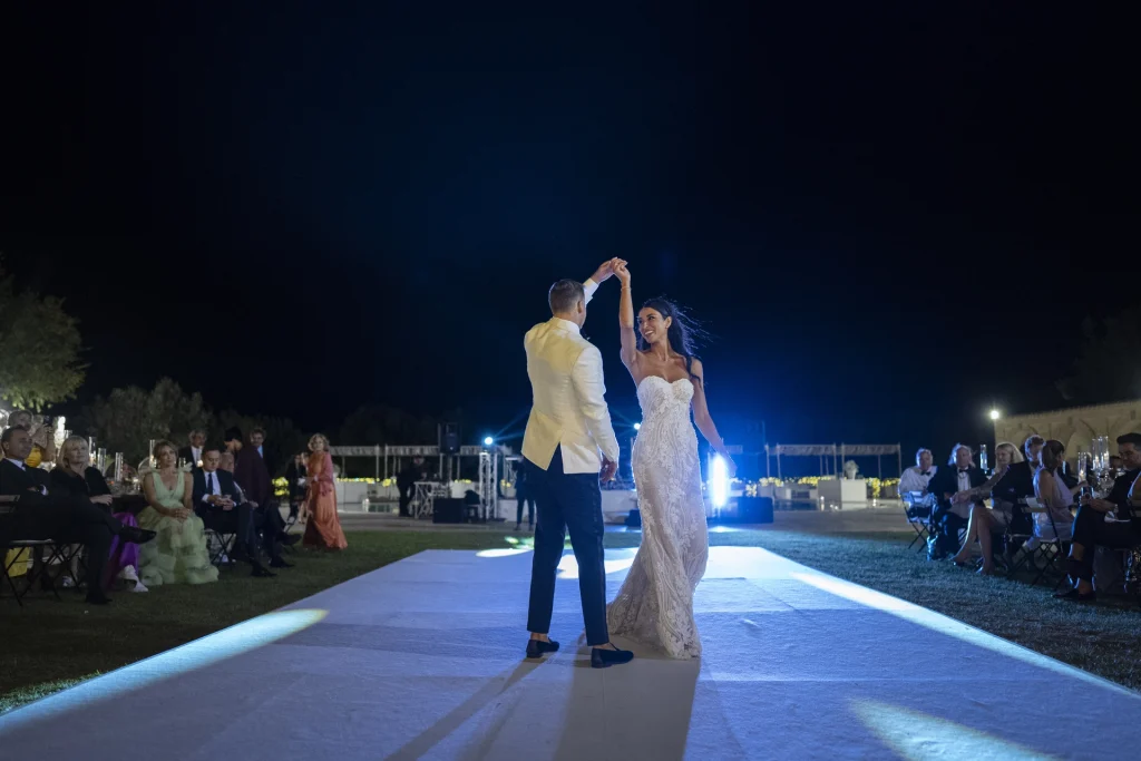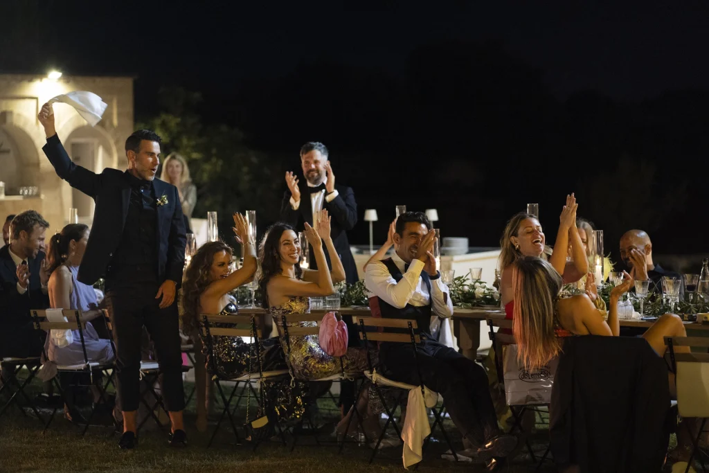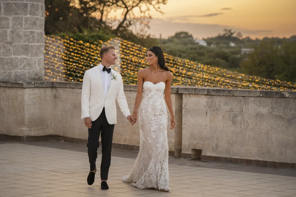 Dopo la cerimonia, gli ospiti si sono riuniti nel cortile centrale della masseria per una cena elegante servita all’aperto. La luce della golden hour ha avvolto ogni tavolo, regalando una sensazione di magia e intimità. La festa è proseguita con una band dal vivo che ha accompagnato gli sposi e i loro amici in una serata fatta di balli, sorrisi, brindisi e pura gioia. La Puglia, ancora una volta, ha dimostrato di essere la scelta perfetta per chi desidera un matrimonio internazionale che unisca autenticità e stile. Per Tom e Kasia, questo giorno non è stato solo un evento: è stato l’inizio di una nuova vita raccontato con emozione, luce e verità.