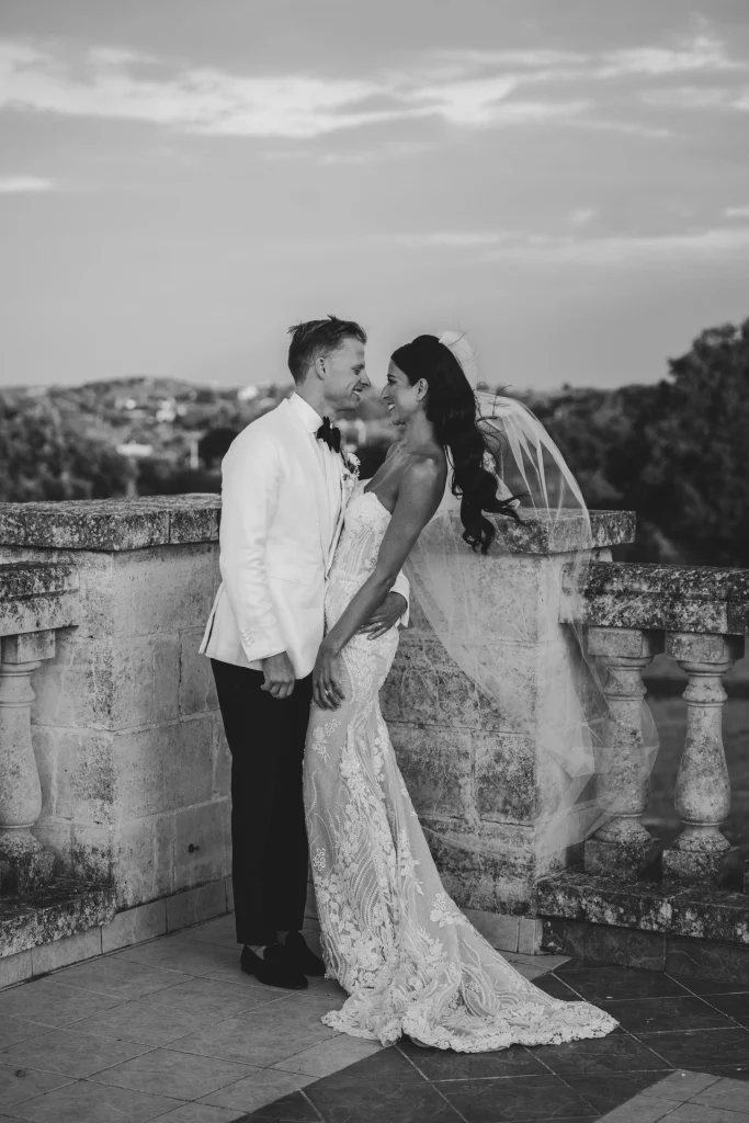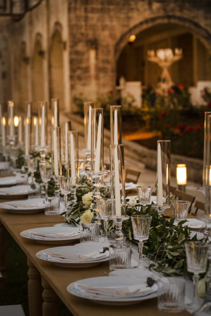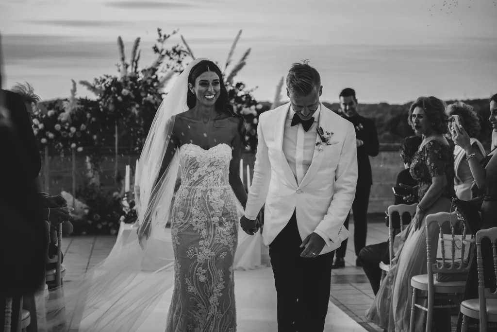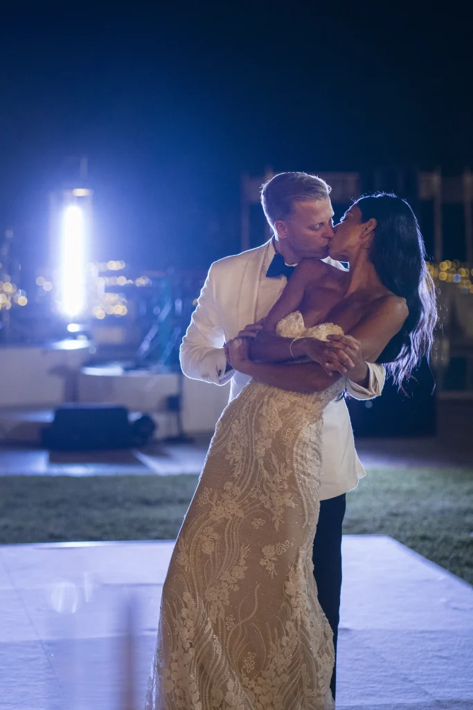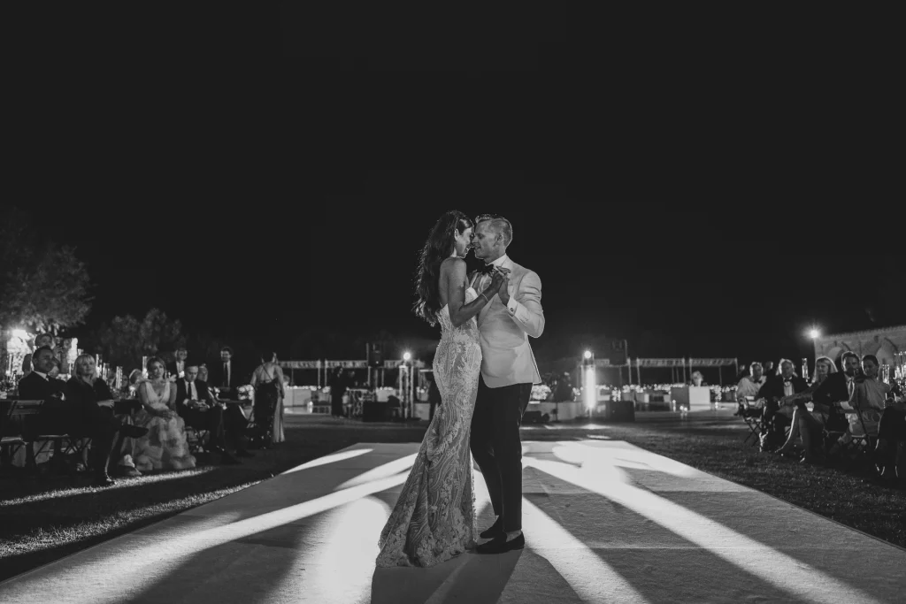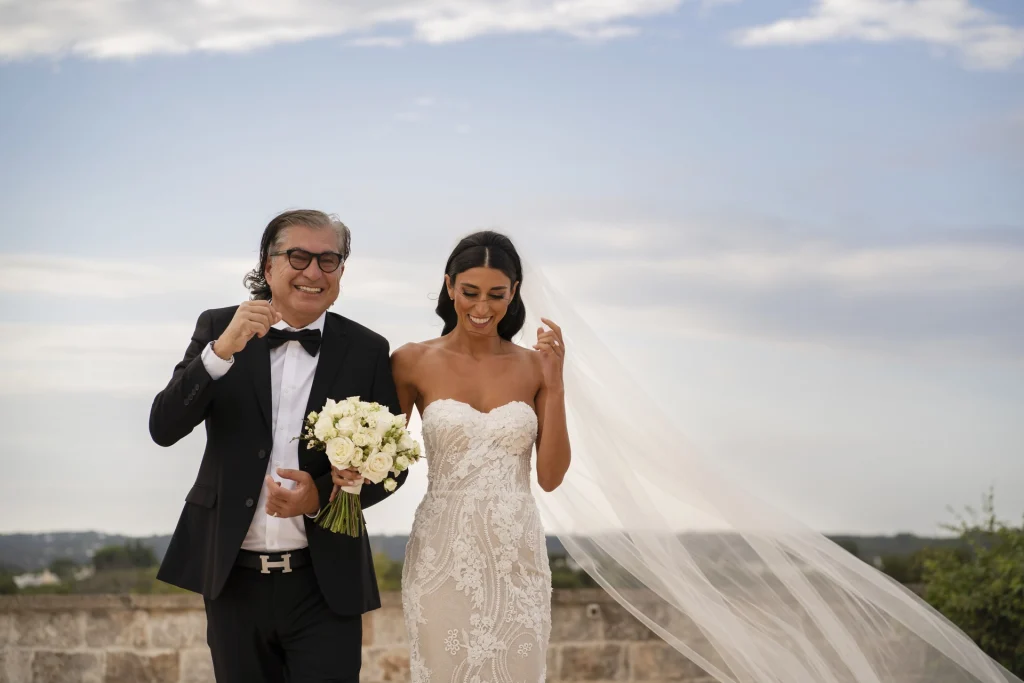 Dopo la cerimonia, gli ospiti si sono riuniti nel cortile centrale della masseria per una cena elegante servita all’aperto. La luce della golden hour ha avvolto ogni tavolo, regalando una sensazione di magia e intimità. La festa è proseguita con una band dal vivo che ha accompagnato gli sposi e i loro amici in una serata fatta di balli, sorrisi, brindisi e pura gioia. La Puglia, ancora una volta, ha dimostrato di essere la scelta perfetta per chi desidera un matrimonio internazionale che unisca autenticità e stile. Per Tom e Kasia, questo giorno non è stato solo un evento: è stato l’inizio di una nuova vita raccontato con emozione, luce e verità.