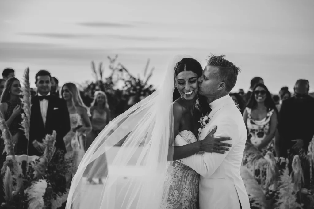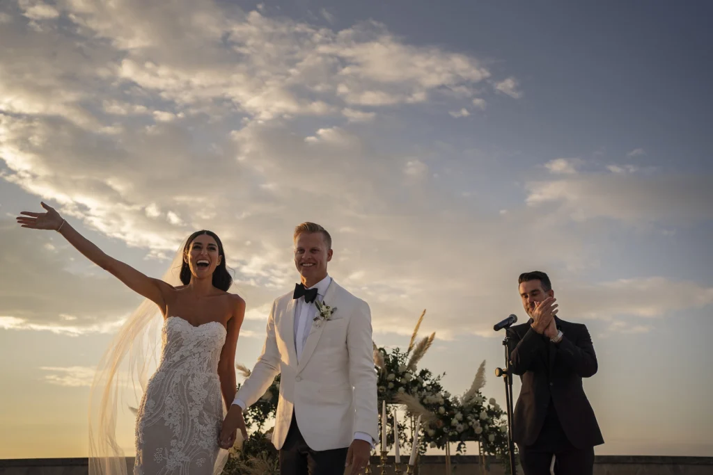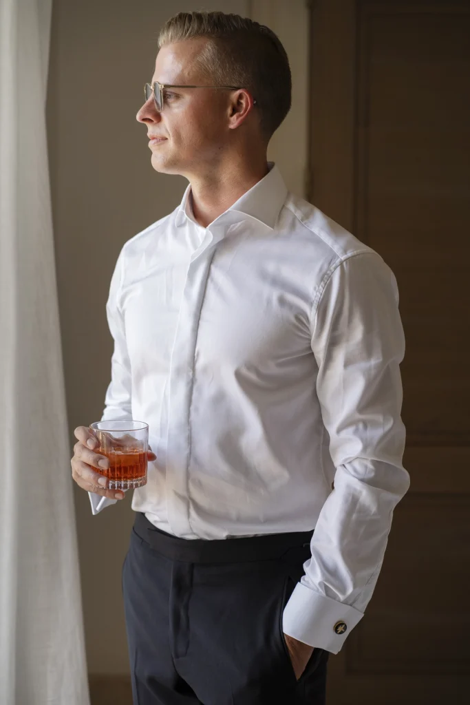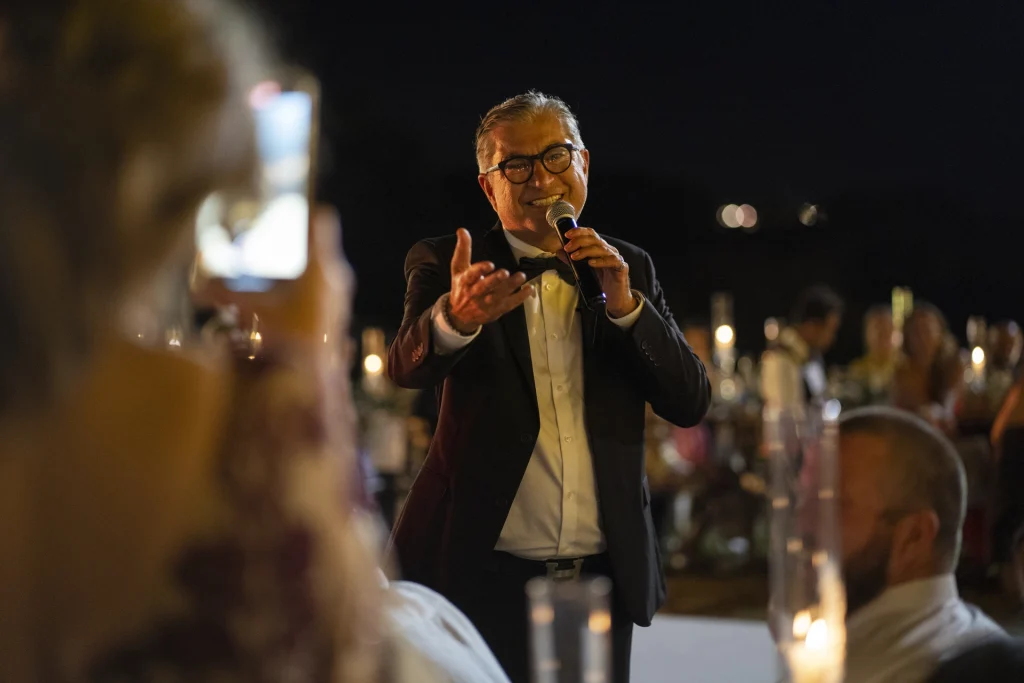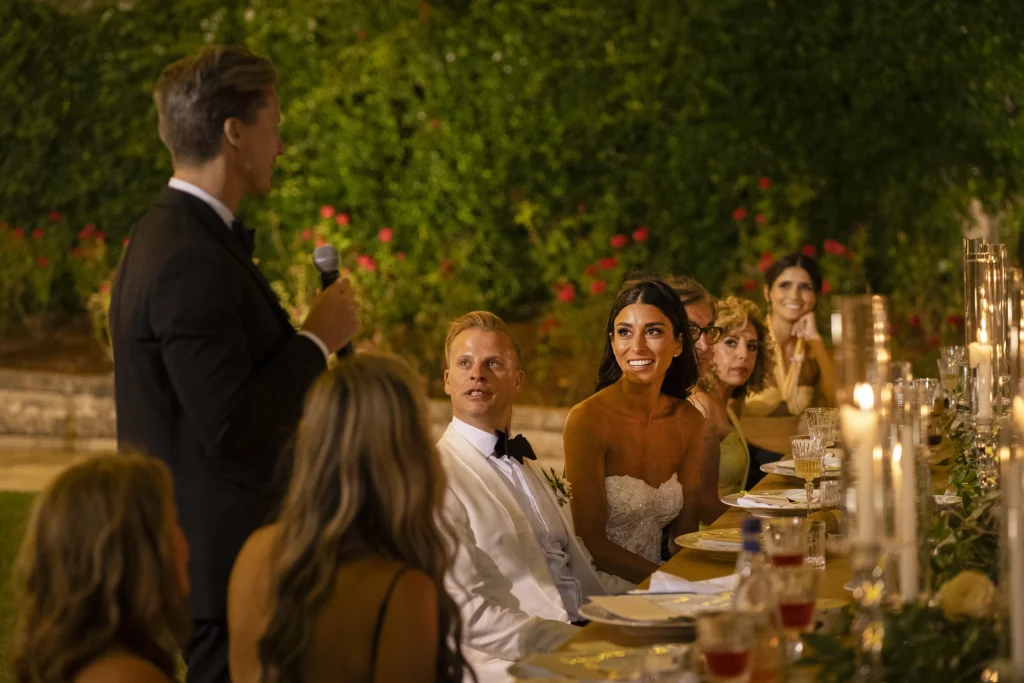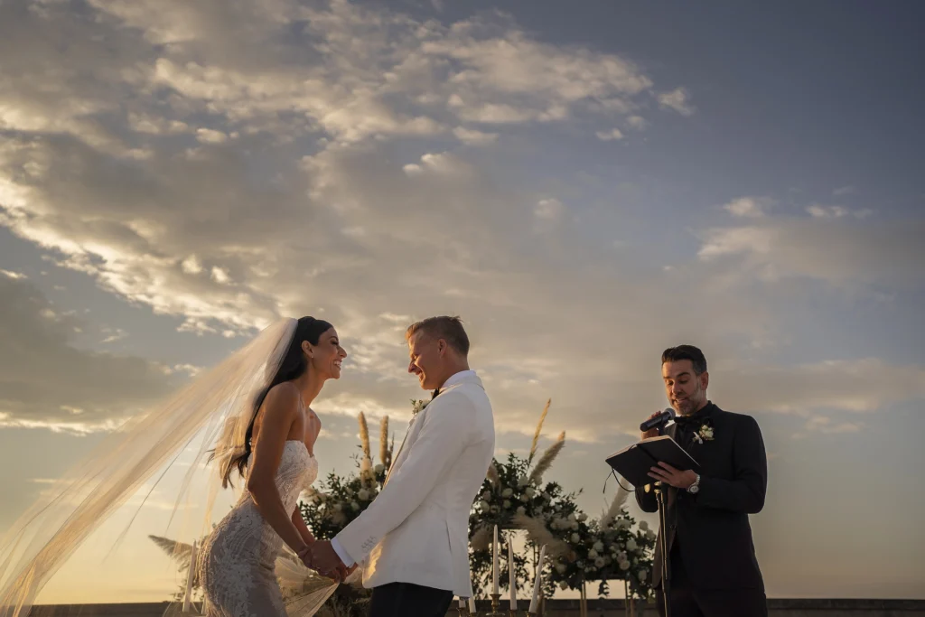 Dopo la cerimonia, gli ospiti si sono riuniti nel cortile centrale della masseria per una cena elegante servita all’aperto. La luce della golden hour ha avvolto ogni tavolo, regalando una sensazione di magia e intimità. La festa è proseguita con una band dal vivo che ha accompagnato gli sposi e i loro amici in una serata fatta di balli, sorrisi, brindisi e pura gioia. La Puglia, ancora una volta, ha dimostrato di essere la scelta perfetta per chi desidera un matrimonio internazionale che unisca autenticità e stile. Per Tom e Kasia, questo giorno non è stato solo un evento: è stato l’inizio di una nuova vita raccontato con emozione, luce e verità.